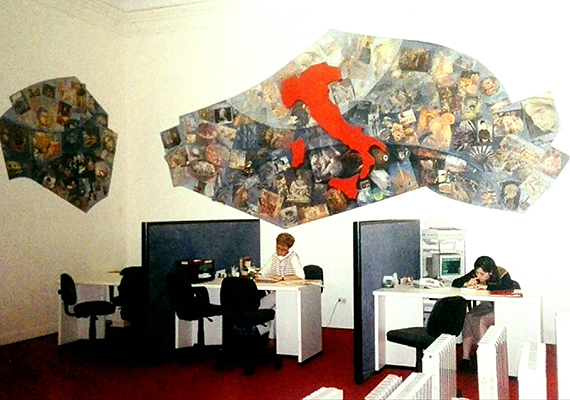 AT realizó en formas irregulares un collage patinado de imágenes de la cultura, la historia, el arte, la moda y la gastronomía italianas desde los primeros tiempos hasta nuestros días. En relieve sobre madera, el perfil geométrico del mapa de Italia.
