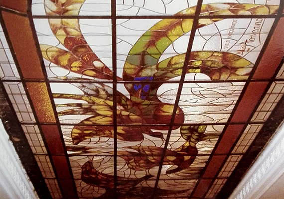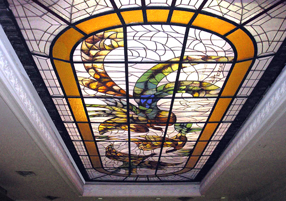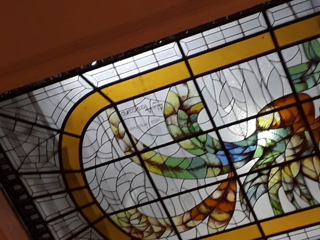 que realizó con técnica medieval de vidrios pintados y